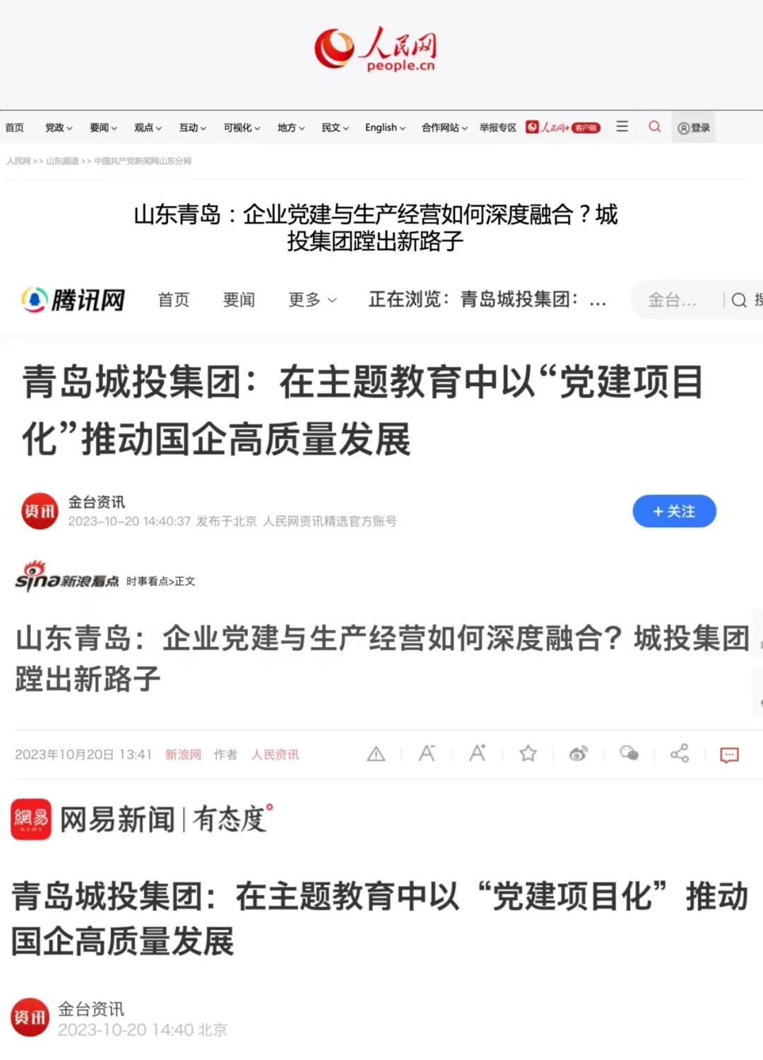 10月20日,人民日報旗下人民網(wǎng)在中國共產(chǎn)黨新聞網(wǎng)、人民網(wǎng)港澳臺版、金臺資訊、騰訊網(wǎng)、網(wǎng)易新聞、新浪網(wǎng)等知名媒體平臺集中報道了《在主題教育中以“黨建項目化”推動國企高質量發(fā)展》《企業(yè)黨建與生產(chǎn)經(jīng)營如何深度融合?城投集團蹚出新路子》兩篇文章16次。青島城投集團“黨建項目化”的創(chuàng)新做法,為國有企業(yè)破解黨建經(jīng)營“兩張皮”難題給出“城投答案”,在互聯(lián)網(wǎng)引發(fā)熱烈反響。