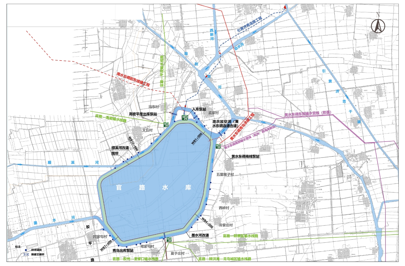 工程位于青島膠州市西北的墨水河下游,北距平度市城區(qū)30km,南距膠州市城區(qū)15km,西距高密市城區(qū)18km。工程主要任務是近期調蓄黃水東調工程水量、當?shù)赜旰樗Y源以及引黃濟青干渠輸送的山東省統(tǒng)籌調配的客水,為青島市城鎮(zhèn)生活及工業(yè)用水提供水源;遠期在雨洪水和黃水東調水量基礎上,新增調蓄山東省統(tǒng)籌調配的南水北調等客水,滿足青島供水需求,并兼顧高密市的部分用水需求。工程規(guī)模為大(2)型,共涉及膠州市、高密市、平度市三個縣級市。水庫總庫容2.11億立方米,死庫容0.19億立方米 ,興利庫容1.92億立方米??偼顿Y約91.45億元,主要建筑物包括水庫圍壩、入庫泵站、青島出庫泵站、高密出庫泵站、泄水洞、墨水河及順溪河改道、引黃濟青連接暗渠等,項目建設期3年。